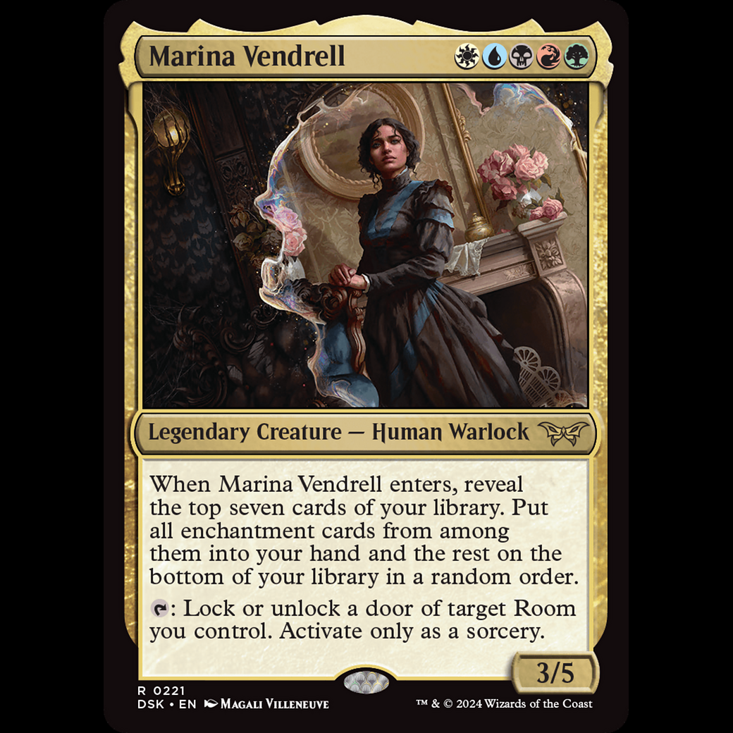 When Marina Vendrell enters, reveal the top seven cards of your library. Put all enchantment cards from among them into your hand and the rest on the bottom of your library in a random order.