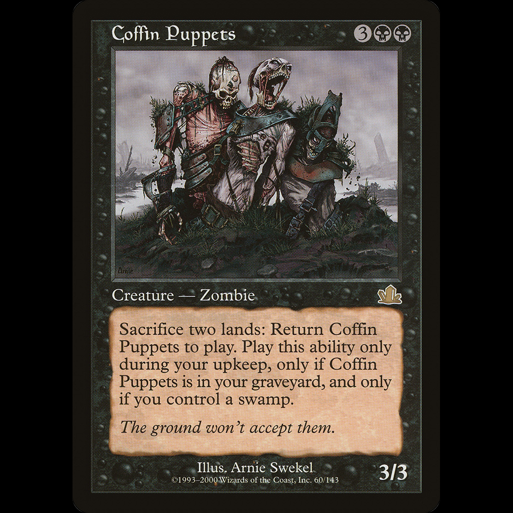 Sacrifice two lands: Return Coffin Puppets from your graveyard to the battlefield. Activate only during your upkeep and only if you control a Swamp.