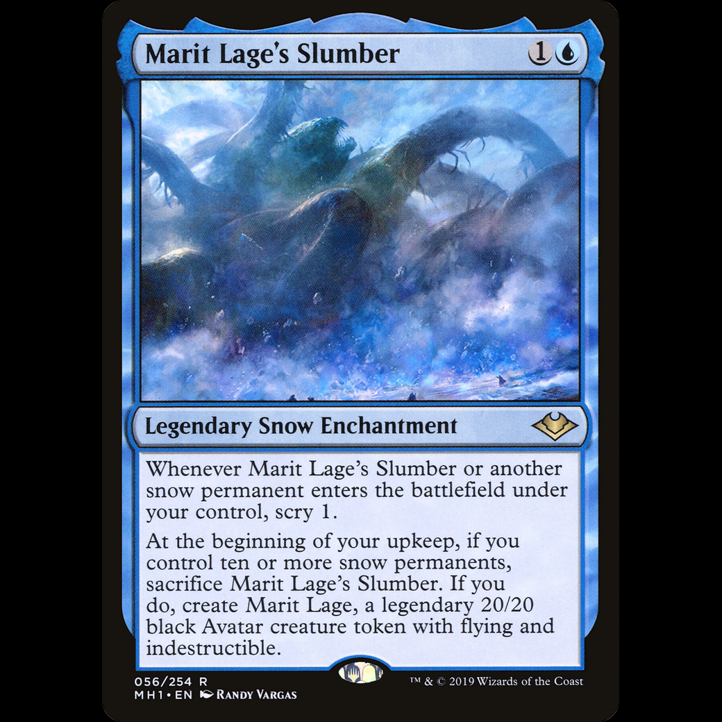 At the beginning of your upkeep, if you control ten or more snow permanents, sacrifice Marit Lage's Slumber. If you do, create Marit Lage, a legendary 20/20 black Avatar creature token with flying and indestructible.