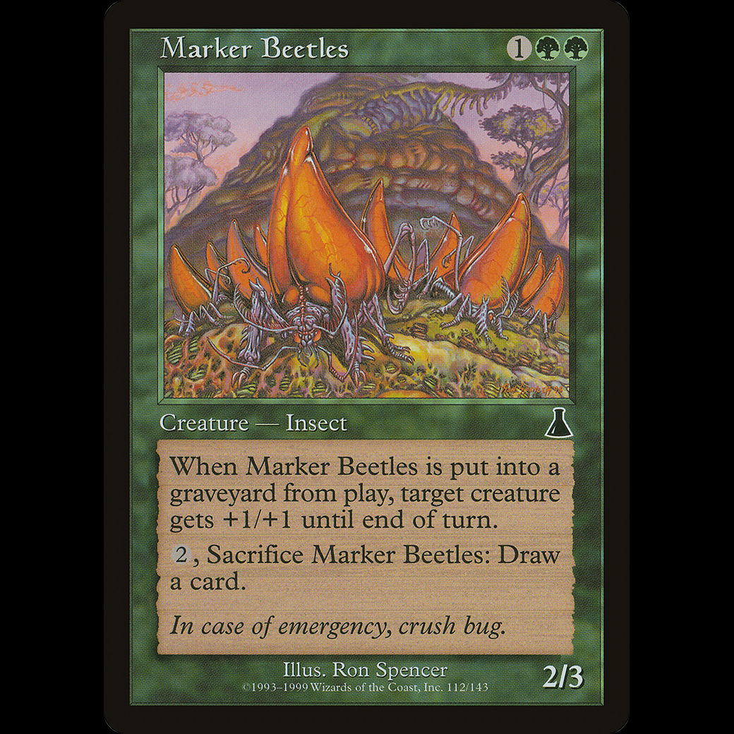 When Marker Beetles dies, target creature gets +1/+1 until end of turn.
