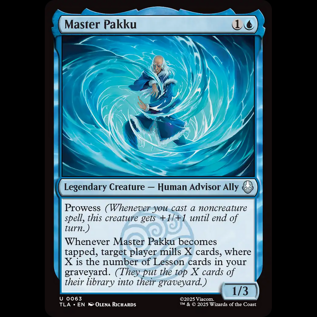 Whenever Master Pakku becomes tapped, target player mills X cards, where X is the number of Lesson cards in your graveyard. (They put the top X cards of their library into their graveyard.)