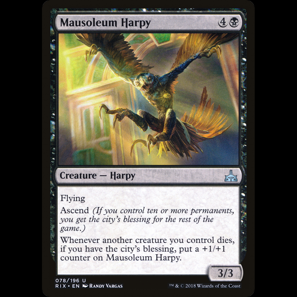 Whenever another creature you control dies, if you have the city's blessing, put a +1/+1 counter on Mausoleum Harpy.