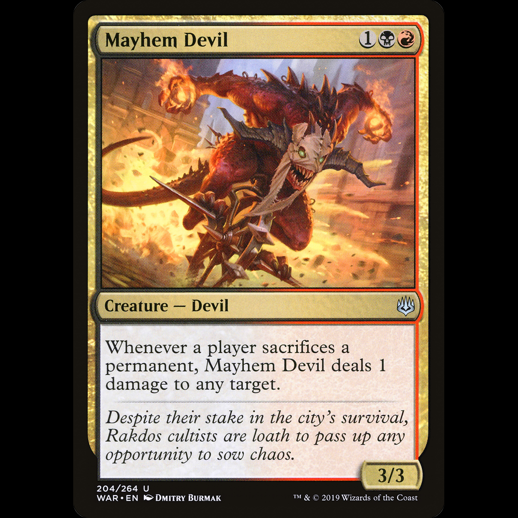 Whenever a player sacrifices a permanent, Mayhem Devil deals 1 damage to any target.