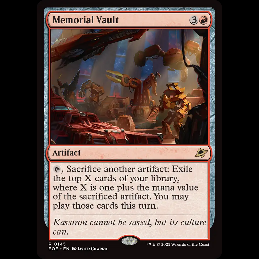 , Sacrifice another artifact: Exile the top X cards of your library, where X is one plus the mana value of the sacrificed artifact. You may play those cards this turn.