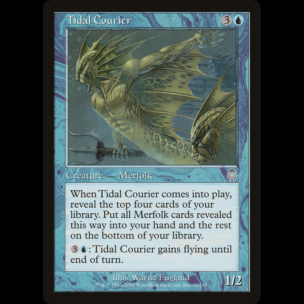 When Tidal Courier enters the battlefield, reveal the top four cards of your library. Put all Merfolk cards revealed this way into your hand and the rest on the bottom of your library in any order.