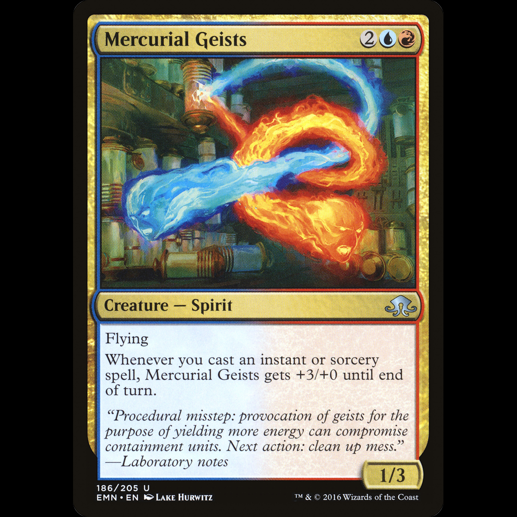 Whenever you cast an instant or sorcery spell, Mercurial Geists gets +3/+0 until end of turn.