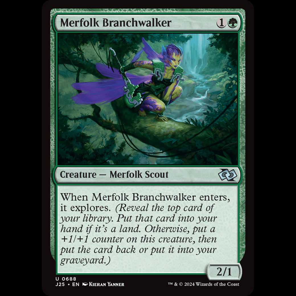 When Merfolk Branchwalker enters, it explores. (Reveal the top card of your library. Put that card into your hand if it's a land. Otherwise, put a +1/+1 counter on this creature, then put the card back or put it into your graveyard.)
