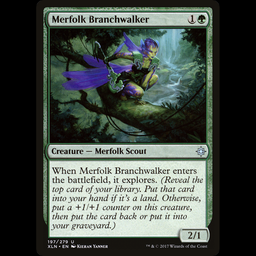 When Merfolk Branchwalker enters the battlefield, it explores. (Reveal the top card of your library. Put that card into your hand if it's a land. Otherwise, put a +1/+1 counter on this creature, then put the card back or put it into your graveyard.)