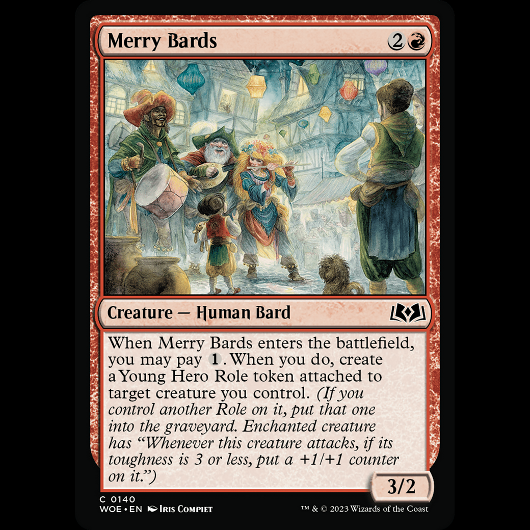 When Merry Bards enters the battlefield, you may pay . When you do, create a Young Hero Role token attached to target creature you control. (If you control another Role on it, put that one into the graveyard. Enchanted creature has "Whenever this creature attacks, if its toughness is 3 or less, put a +1/+1 counter on it.")