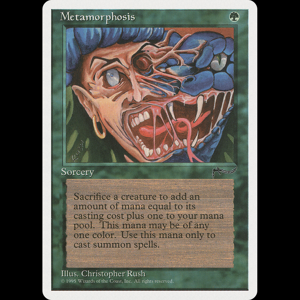 MTG Metamorphosis ChroniclesAs an additional cost to cast this spell, sacrifice a creature. Add X mana of any one color, where X is 1 plus the sacrificed creature's mana value. Spend this mana only to cast creature spells.