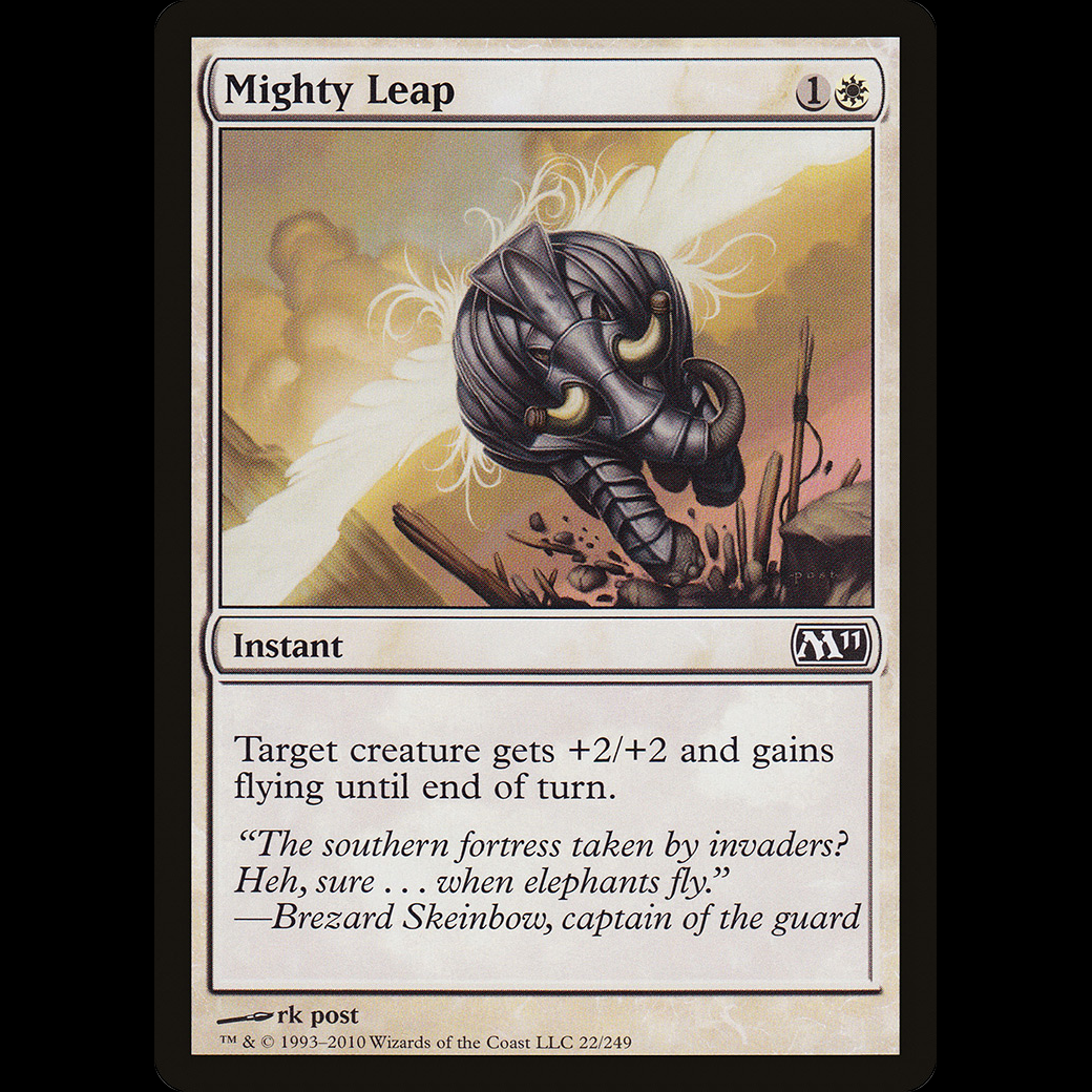 MTG Mighty Leap Magic 2011Target creature gets +2/+2 and gains flying until end of turn.