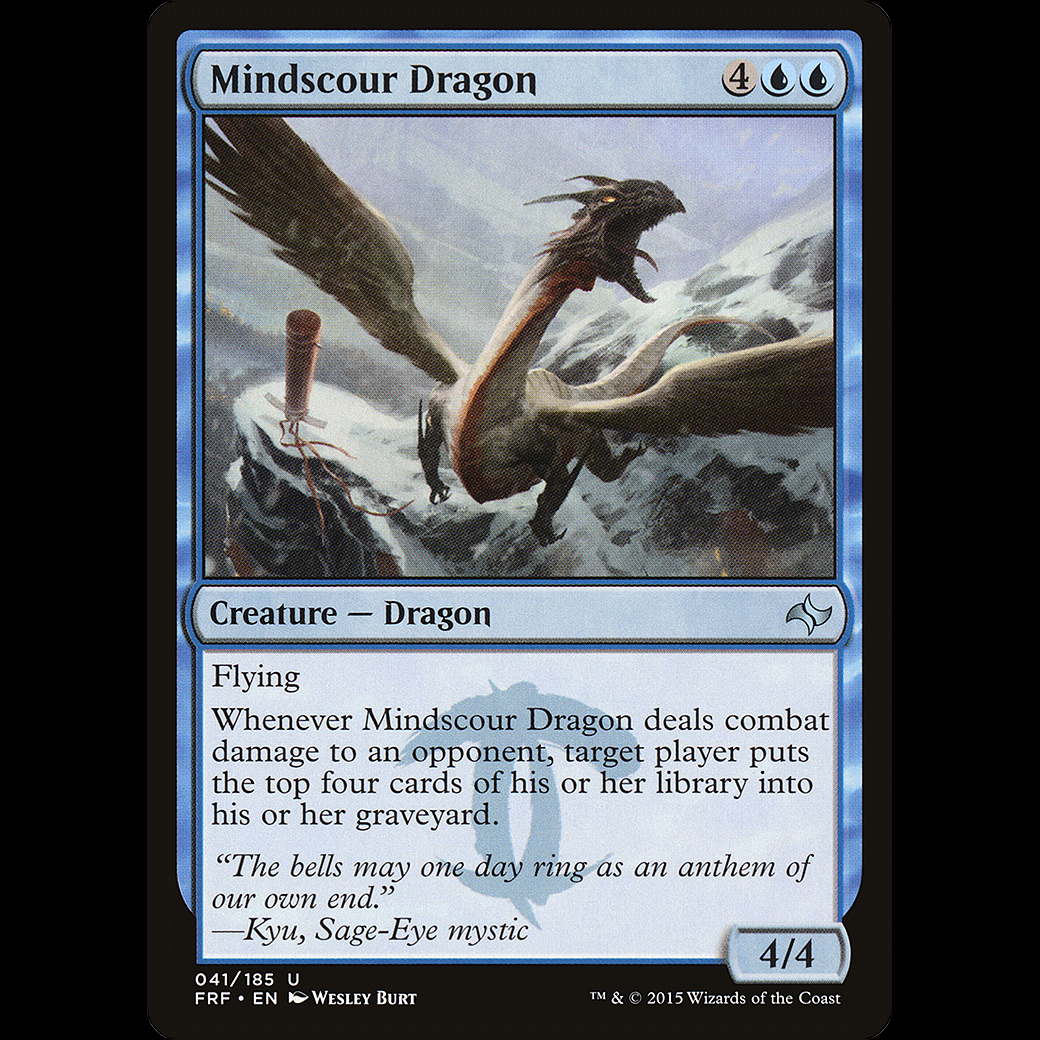 Whenever Mindscour Dragon deals combat damage to an opponent, target player mills four cards.