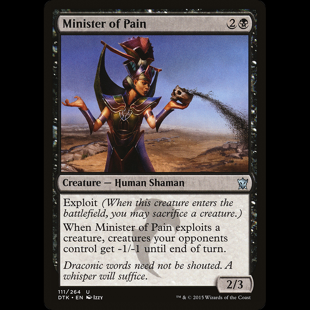 When Minister of Pain exploits a creature, creatures your opponents control get -1/-1 until end of turn.