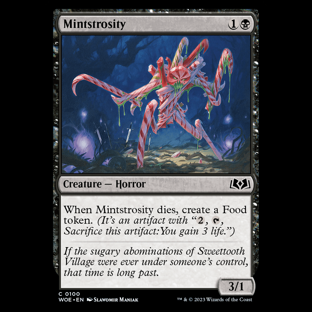 When Mintstrosity dies, create a Food token. (It's an artifact with ", , Sacrifice this artifact: You gain 3 life.")
