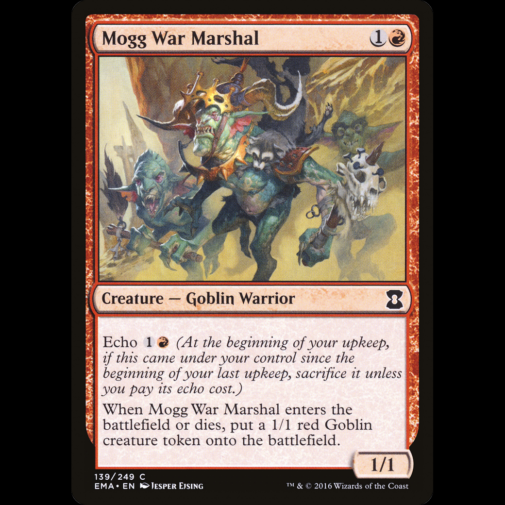 When Mogg War Marshal enters the battlefield or dies, create a 1/1 red Goblin creature token.