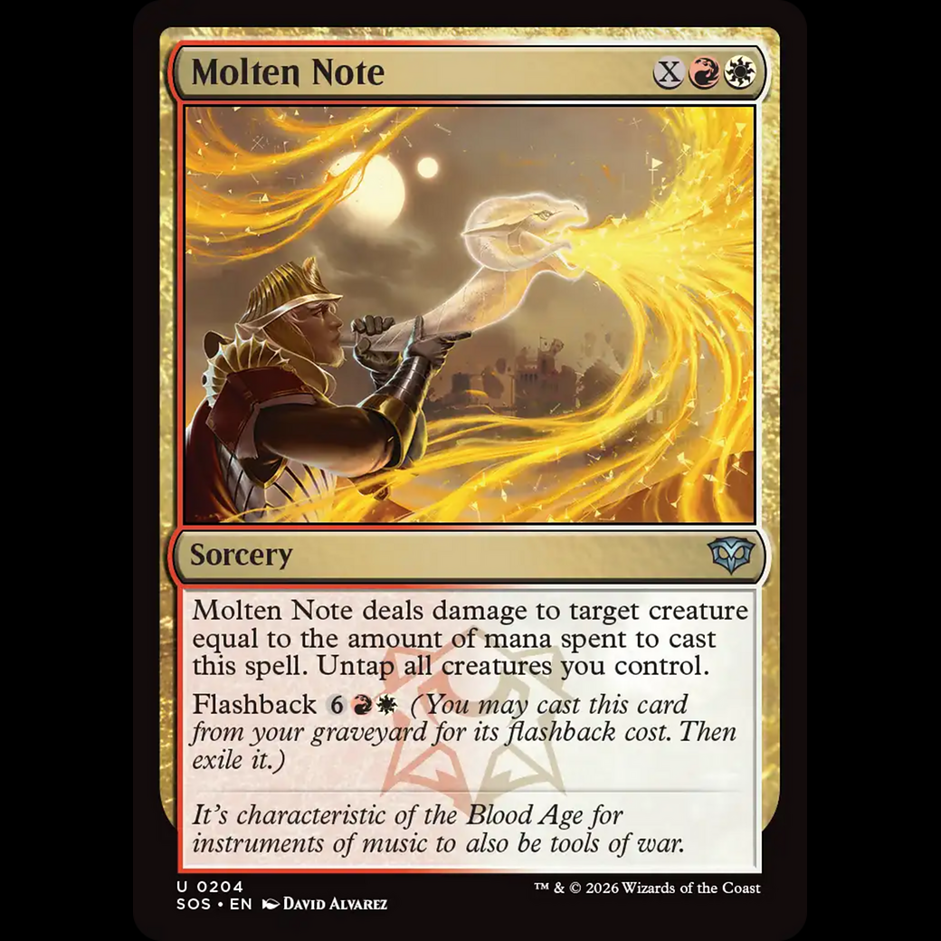 Molten Note deals damage to target creature equal to the amount of mana spent to cast this spell. Untap all creatures you control.