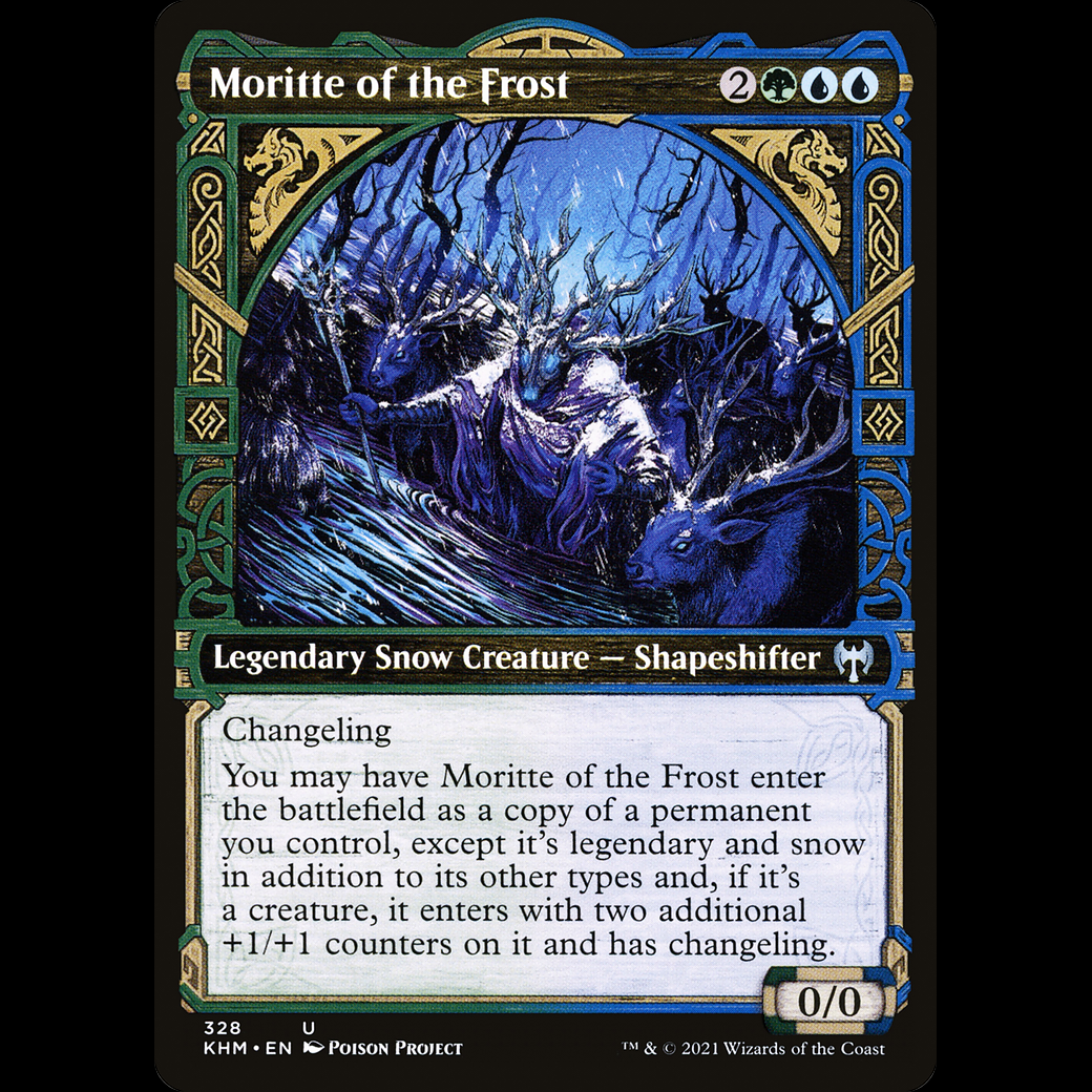 You may have Moritte of the Frost enter the battlefield as a copy of a permanent you control, except it's legendary and snow in addition to its other types and, if it's a creature, it enters with two additional +1/+1 counters on it and has changeling.