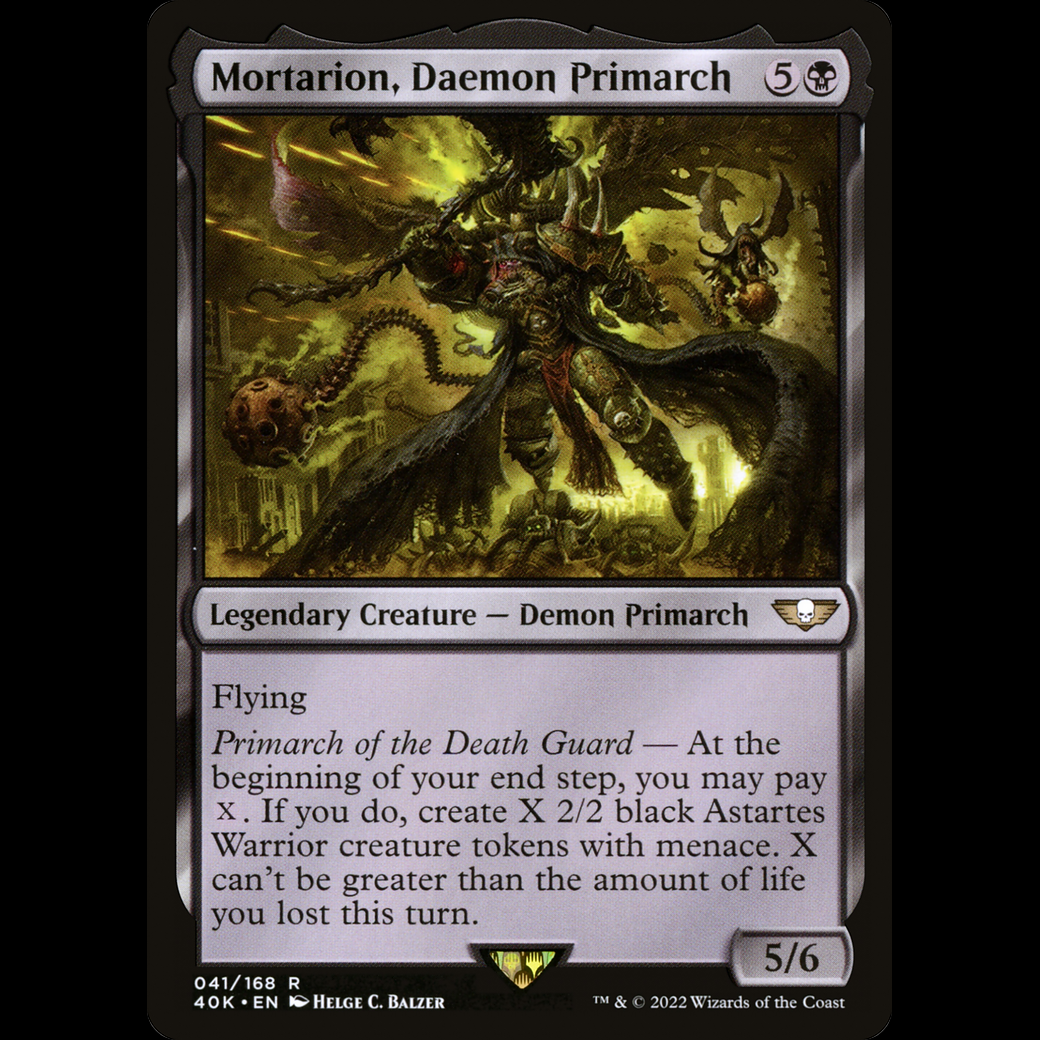 MTG Mortarion, Daemon Primarch Warhammer 40,000 Commander 40k#41 Flying Primarch of the Death Guard — At the beginning of your end step, you may pay . If you do, create X 2/2 black Astartes Warrior creature tokens with menace. X can't be greater than the amount of life you lost this turn.