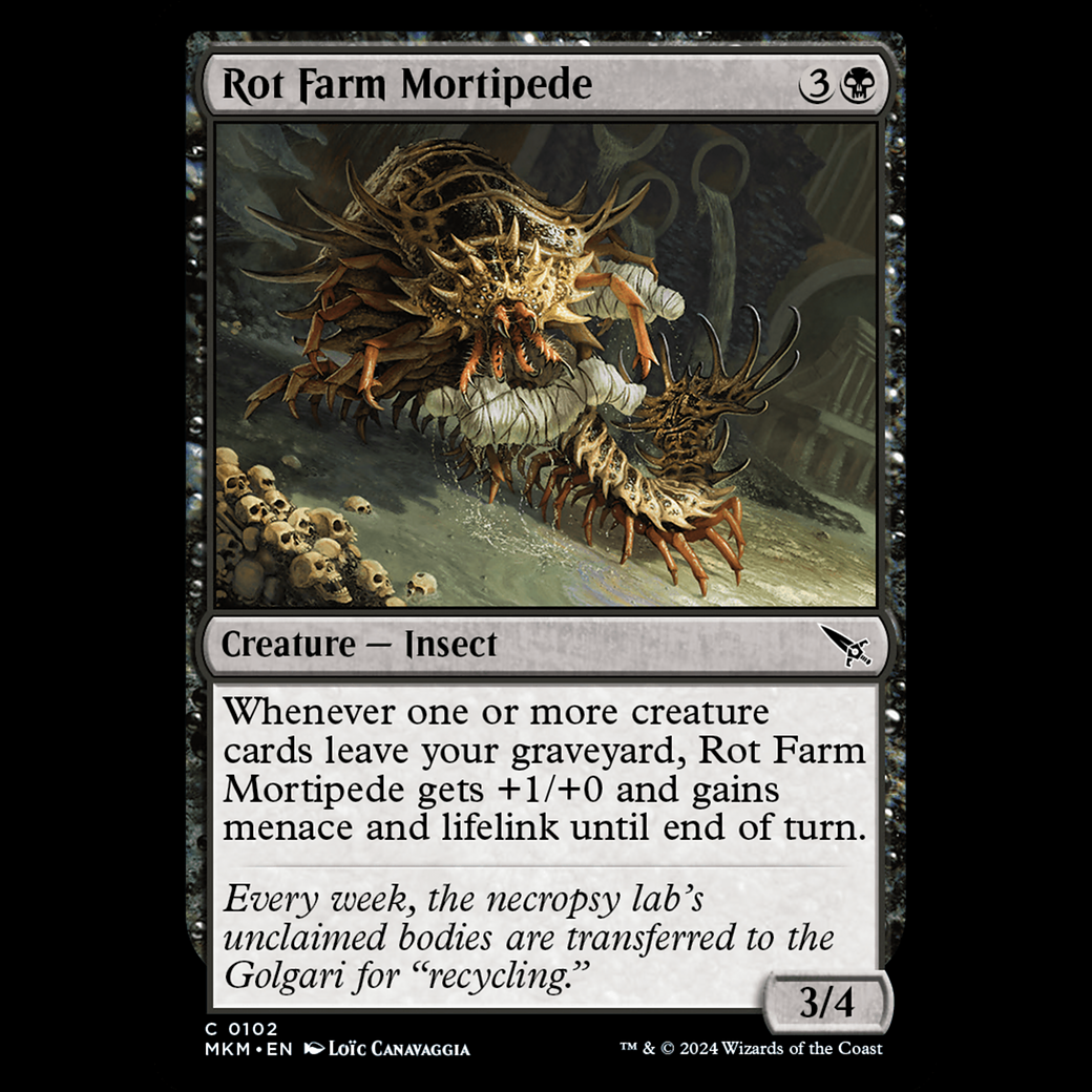 Whenever one or more creature cards leave your graveyard, Rot Farm Mortipede gets +1/+0 and gains menace and lifelink until end of turn.