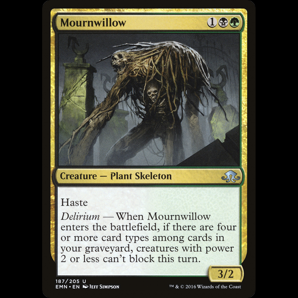 Delirium — When Mournwillow enters the battlefield, if there are four or more card types among cards in your graveyard, creatures with power 2 or less can't block this turn.