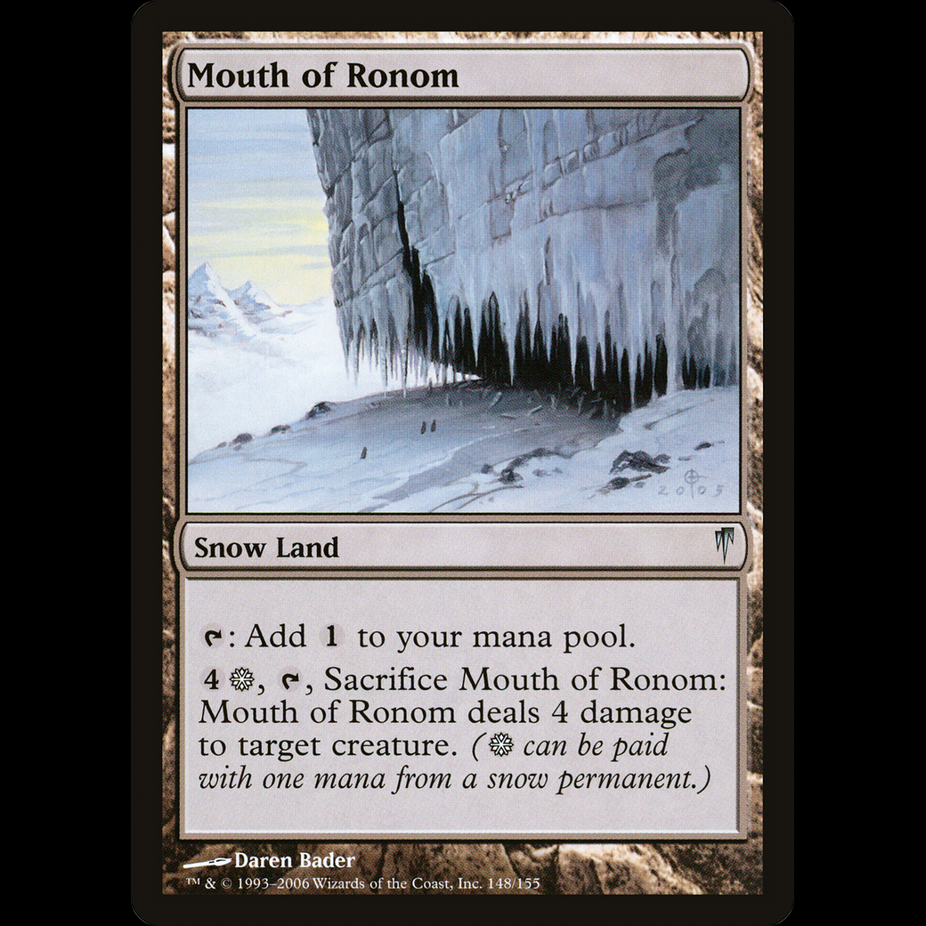 , , Sacrifice Mouth of Ronom: It deals 4 damage to target creature. ( can be paid with one mana from a snow source.)