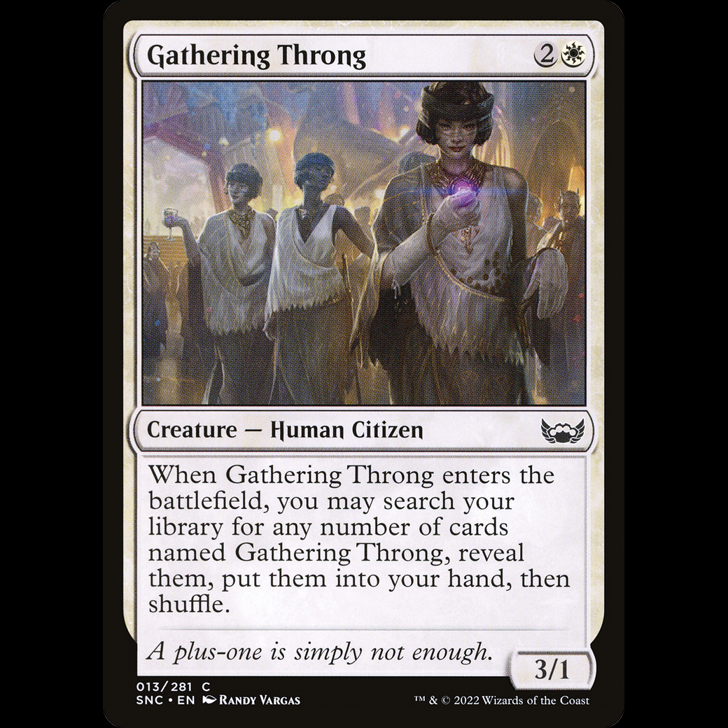 When this creature enters, you may search your library for any number of cards named Gathering Throng, reveal them, put them into your hand, then shuffle.
