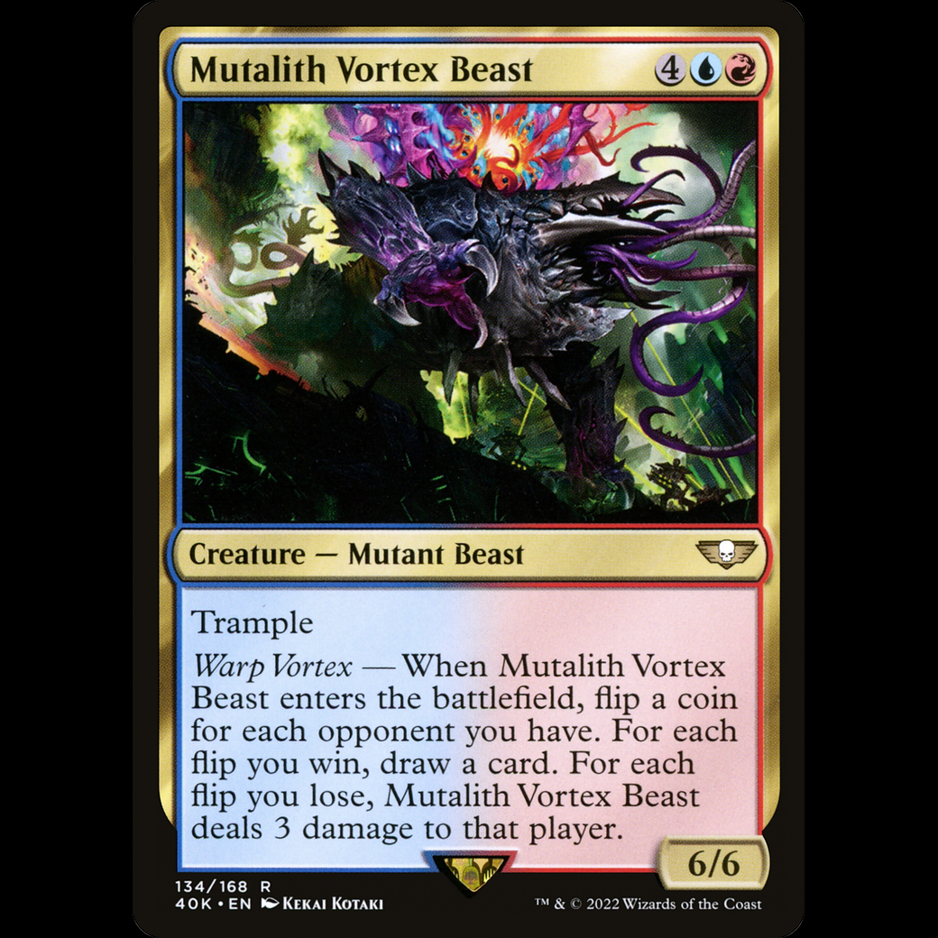 MTG Mutalith Vortex Beast Warhammer 40,000 Commander 40k#134 Trample Warp Vortex — When Mutalith Vortex Beast enters, flip a coin for each opponent you have. For each flip you win, draw a card. For each flip you lose, Mutalith Vortex Beast deals 3 damage to that player.