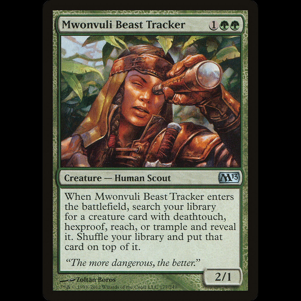 When Mwonvuli Beast Tracker enters the battlefield, search your library for a creature card with deathtouch, hexproof, reach, or trample and reveal it. Shuffle and put that card on top.