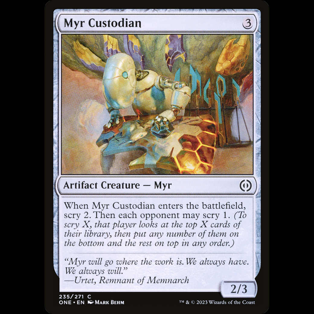 When Myr Custodian enters, scry 2. Then each opponent may scry 1. (To scry X, a player looks at the top X cards of their library, then puts any number of them on the bottom and the rest on top in any order.)