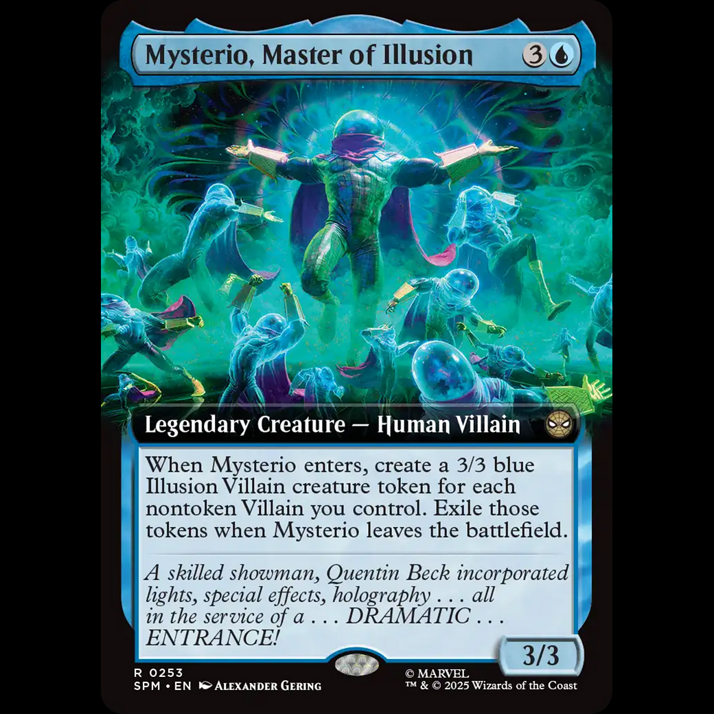 When Mysterio enters, create a 3/3 blue Illusion Villain creature token for each nontoken Villain you control. Exile those tokens when Mysterio leaves the battlefield.