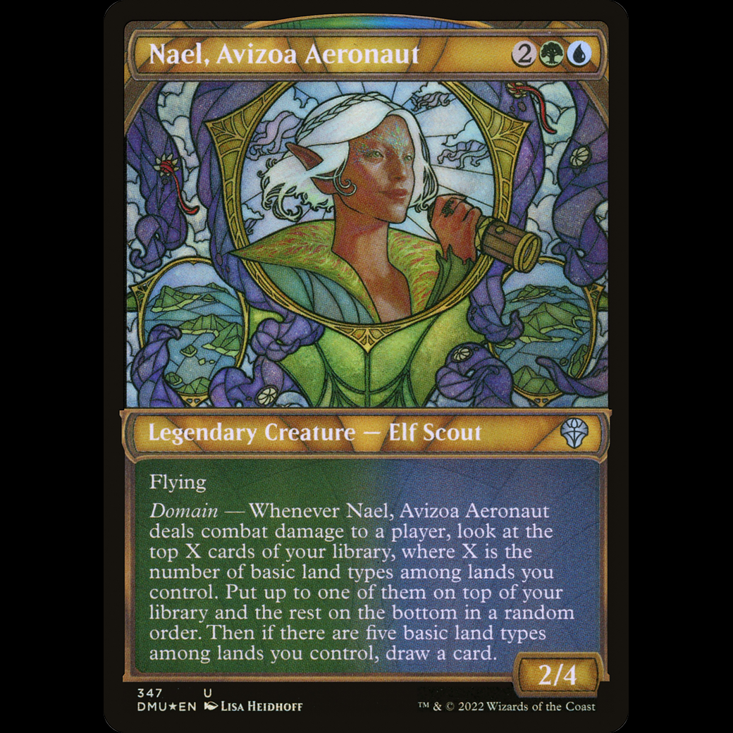 Domain — Whenever Nael deals combat damage to a player, look at the top X cards of your library, where X is the number of basic land types among lands you control. Put up to one of them on top of your library and the rest on the bottom in a random order. Then if there are five basic land types among lands you control, draw a card.