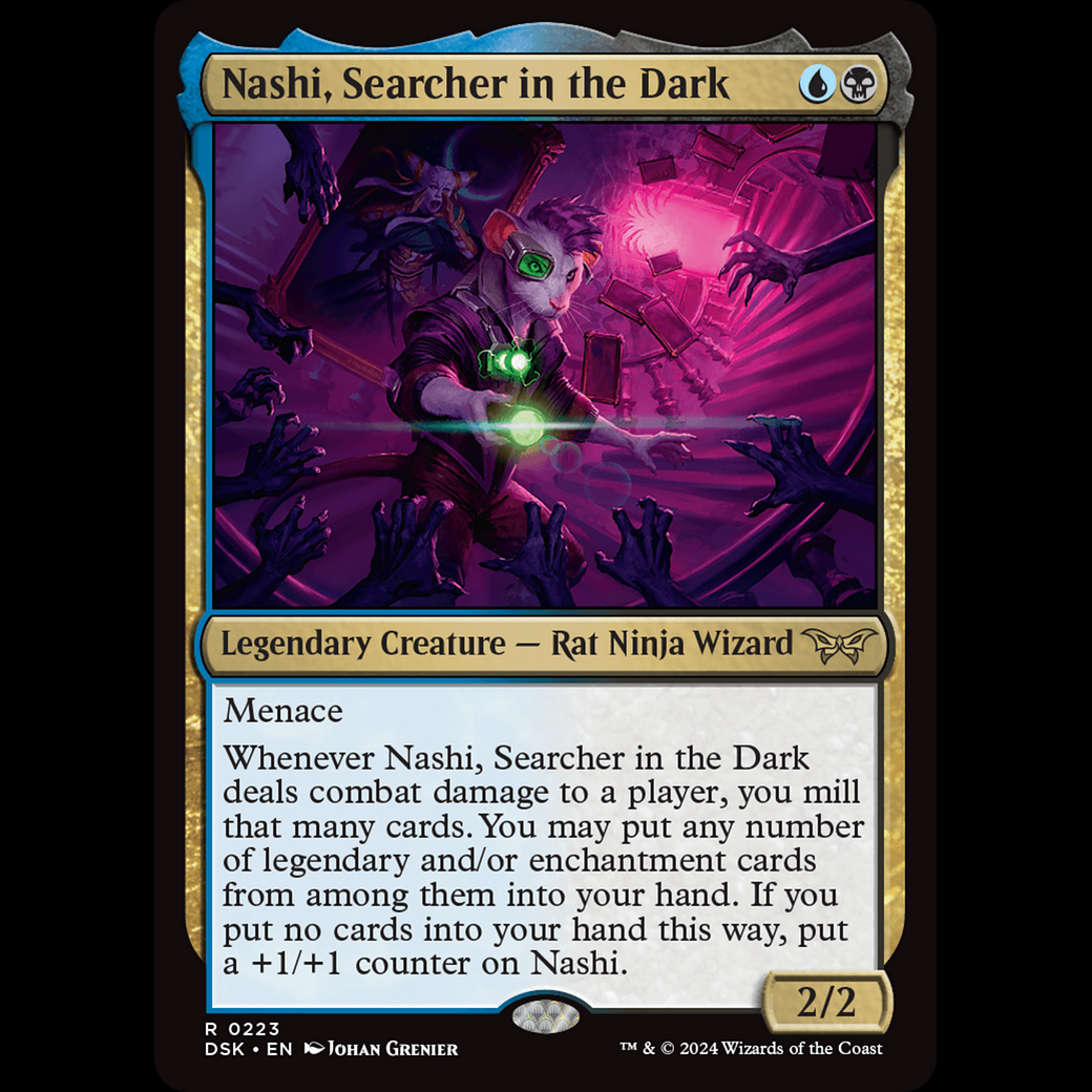 Whenever Nashi, Searcher in the Dark deals combat damage to a player, you mill that many cards. You may put any number of legendary and/or enchantment cards from among them into your hand. If you put no cards into your hand this way, put a +1/+1 counter on Nashi.