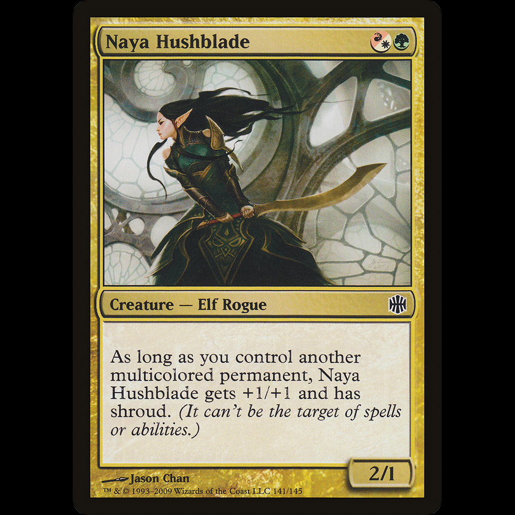 As long as you control another multicolored permanent, Naya Hushblade gets +1/+1 and has shroud. (It can't be the target of spells or abilities.)