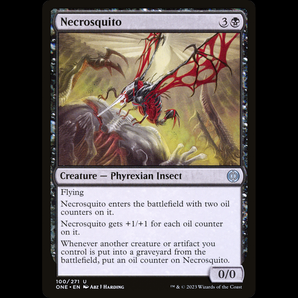 Whenever another creature or artifact you control is put into a graveyard from the battlefield, put an oil counter on Necrosquito.