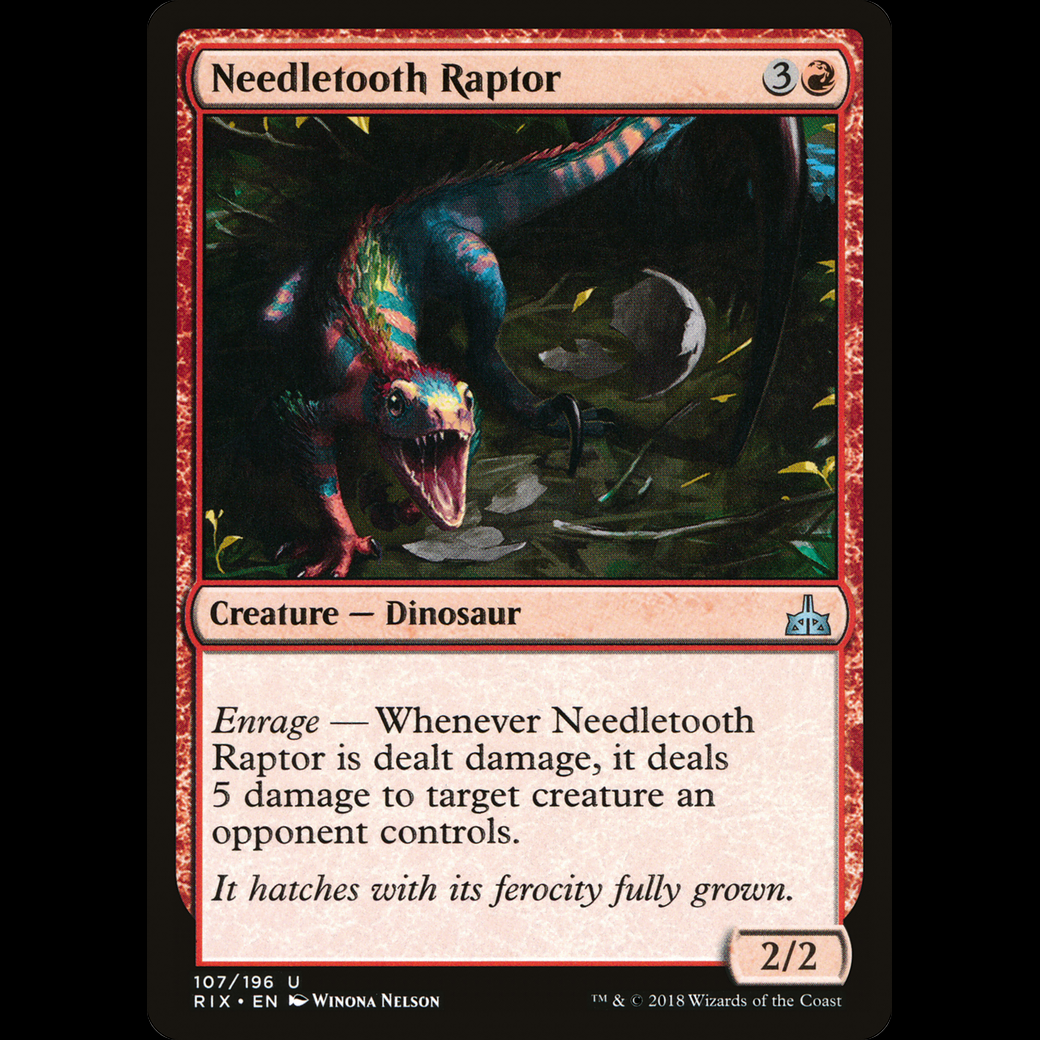 Enrage — Whenever Needletooth Raptor is dealt damage, it deals 5 damage to target creature an opponent controls.