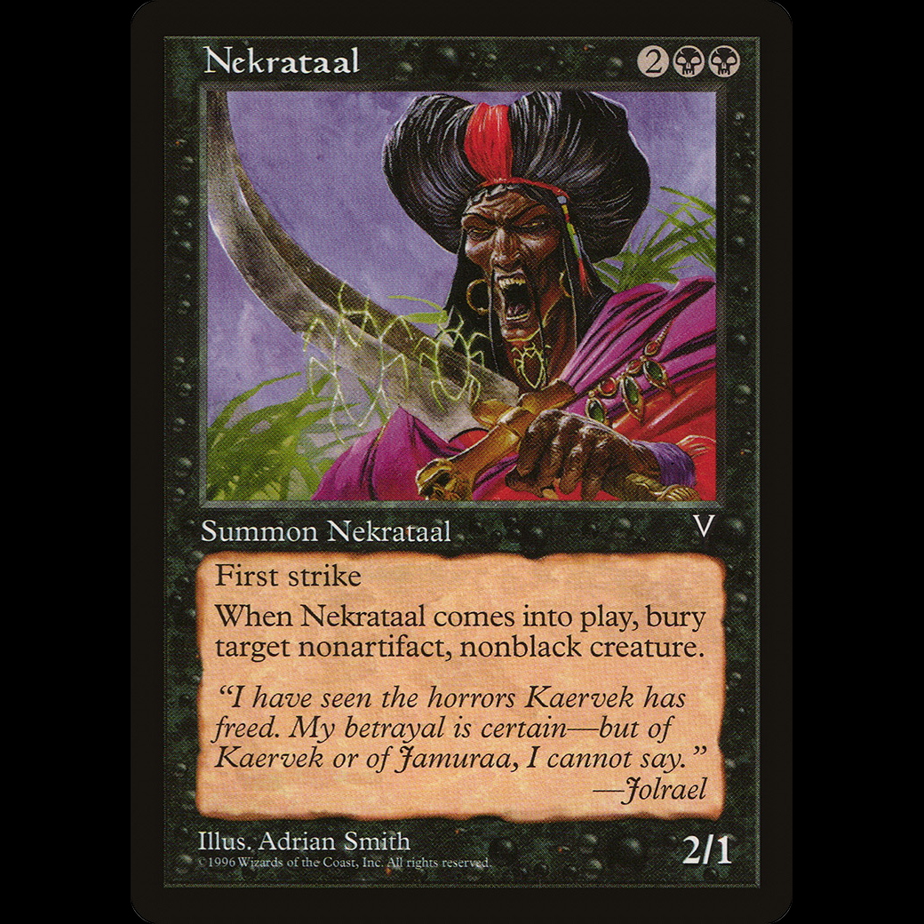 When Nekrataal enters the battlefield, destroy target nonartifact, nonblack creature. That creature can't be regenerated.