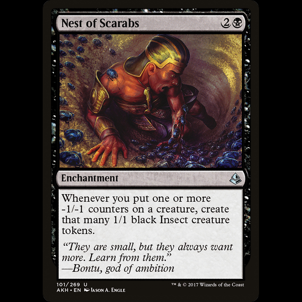 Whenever you put one or more -1/-1 counters on a creature, create that many 1/1 black Insect creature tokens.