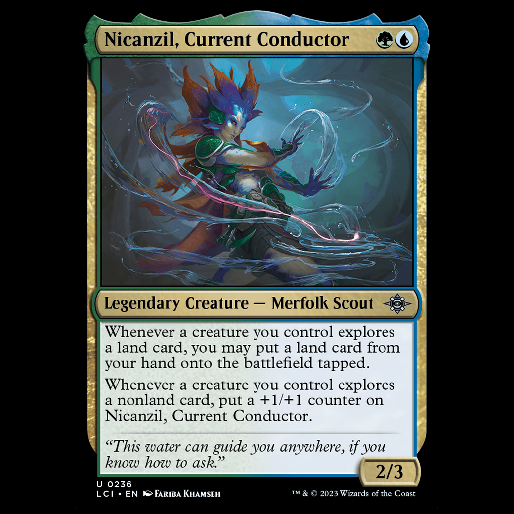 Whenever a creature you control explores a nonland card, put a +1/+1 counter on Nicanzil, Current Conductor.