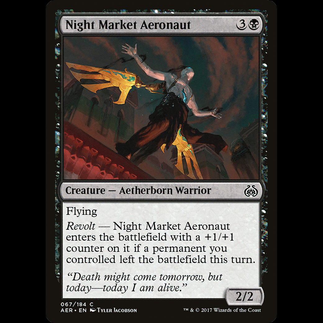 Revolt — Night Market Aeronaut enters the battlefield with a +1/+1 counter on it if a permanent you controlled left the battlefield this turn.