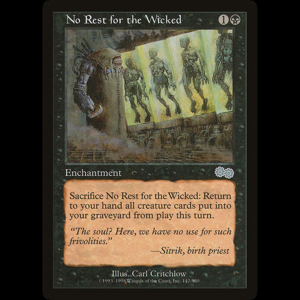 Sacrifice No Rest for the Wicked: Return to your hand all creature cards in your graveyard that were put there from the battlefield this turn.