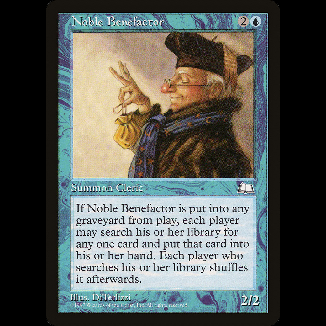 When Noble Benefactor dies, each player may search their library for a card and put that card into their hand. Then each player who searched their library this way shuffles.