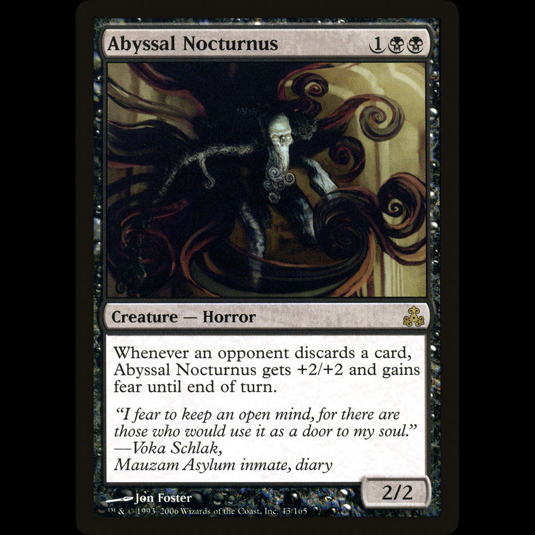Whenever an opponent discards a card, Abyssal Nocturnus gets +2/+2 and gains fear until end of turn. (It can't be blocked except by artifact creatures and/or black creatures.)