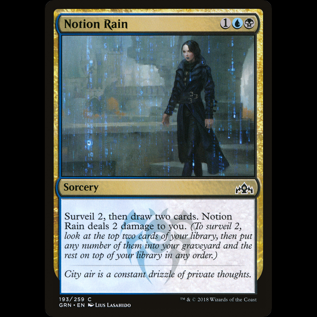Surveil 2, then draw two cards. Notion Rain deals 2 damage to you. (To surveil 2, look at the top two cards of your library, then put any number of them into your graveyard and the rest on top of your library in any order.)