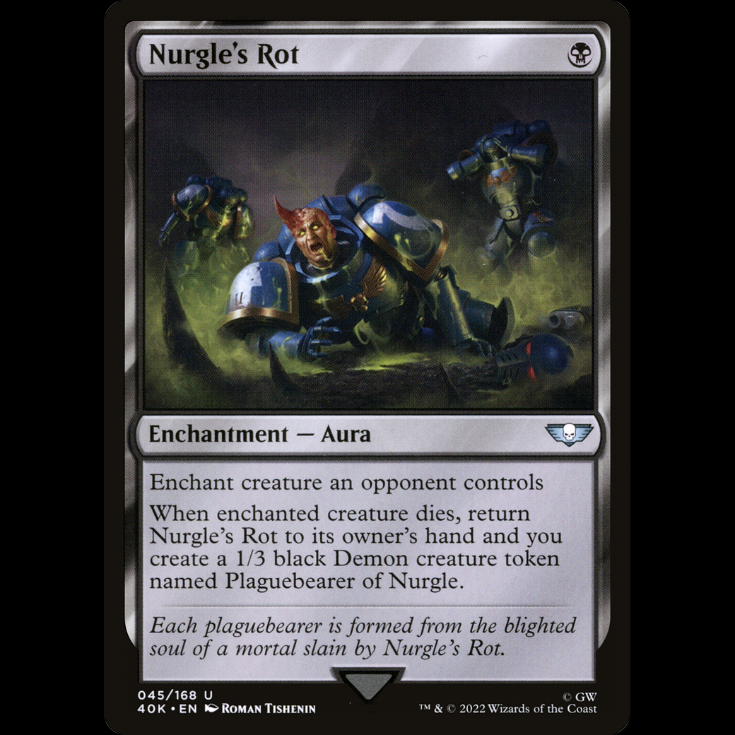 MTG Nurgle's Rot Warhammer 40,000 Commander 40k#45 Enchant creature an opponent controls When enchanted creature dies, return Nurgle's Rot to its owner's hand and you create a 1/3 black Demon creature token named Plaguebearer of Nurgle.