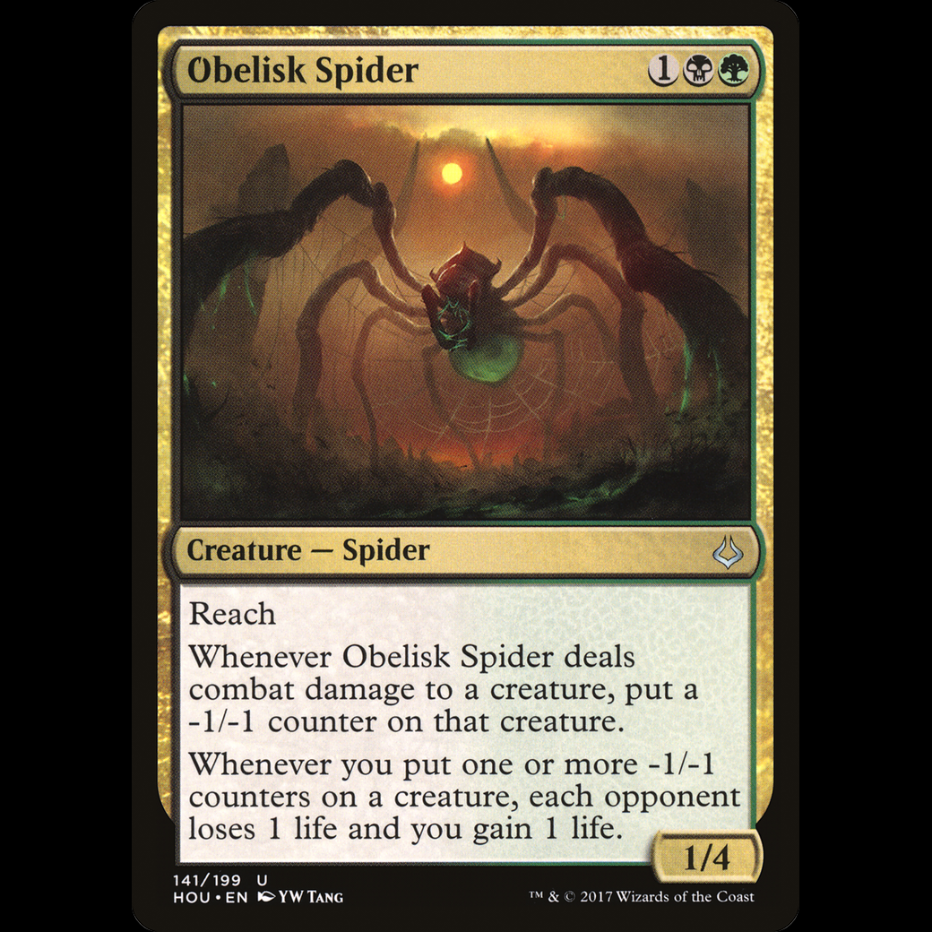 Whenever Obelisk Spider deals combat damage to a creature, put a -1/-1 counter on that creature.