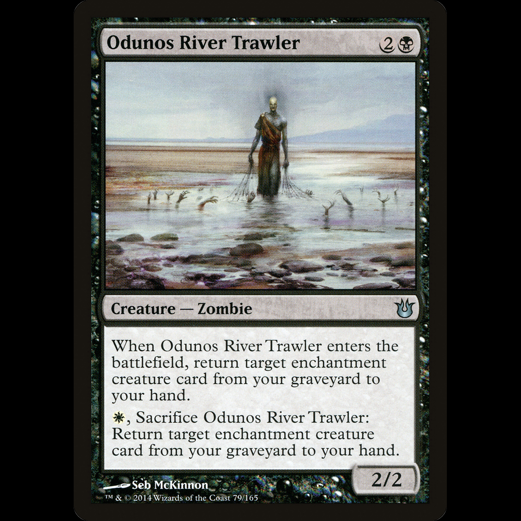 , Sacrifice Odunos River Trawler: Return target enchantment creature card from your graveyard to your hand.