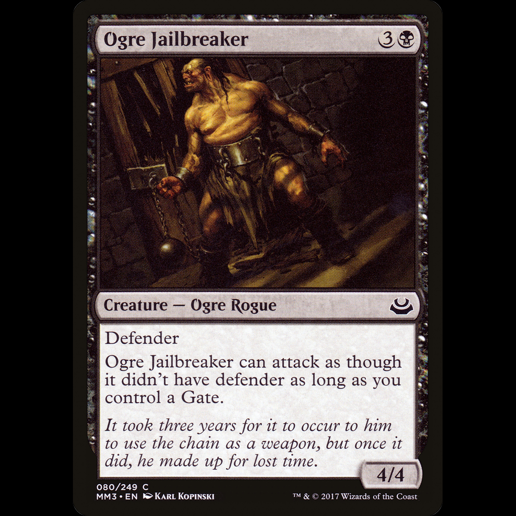 Ogre Jailbreaker can attack as though it didn't have defender as long as you control a Gate.