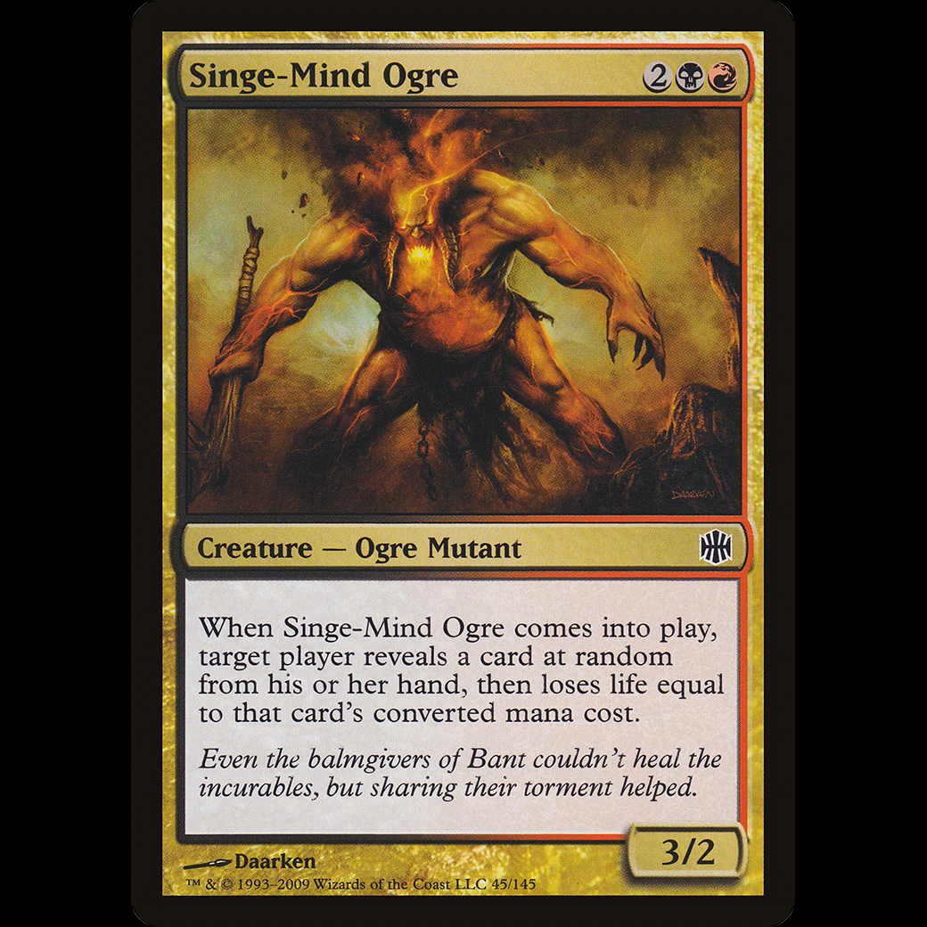 When Singe-Mind Ogre enters the battlefield, target player reveals a card at random from their hand, then loses life equal to that card's mana value.