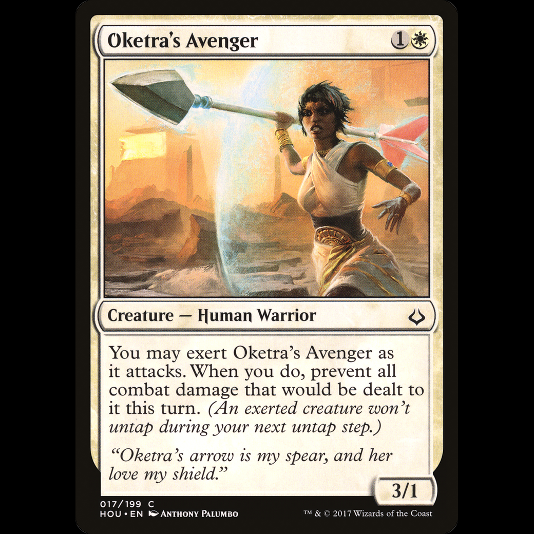 You may exert Oketra's Avenger as it attacks. When you do, prevent all combat damage that would be dealt to it this turn. (An exerted creature won't untap during your next untap step.)