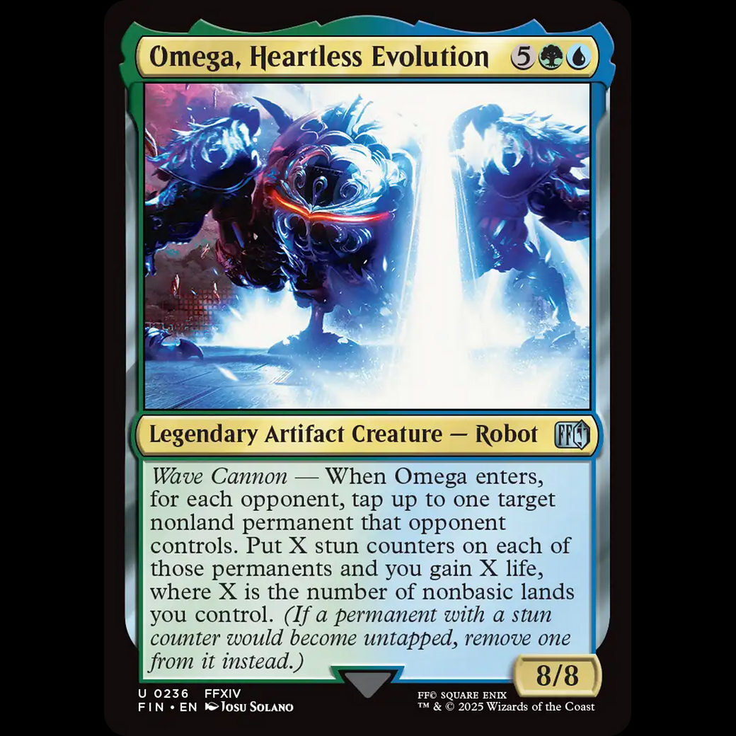 Wave Cannon — When Omega enters, for each opponent, tap up to one target nonland permanent that opponent controls. Put X stun counters on each of those permanents and you gain X life, where X is the number of nonbasic lands you control. (If a permanent with a stun counter would become untapped, remove one from it instead.)
